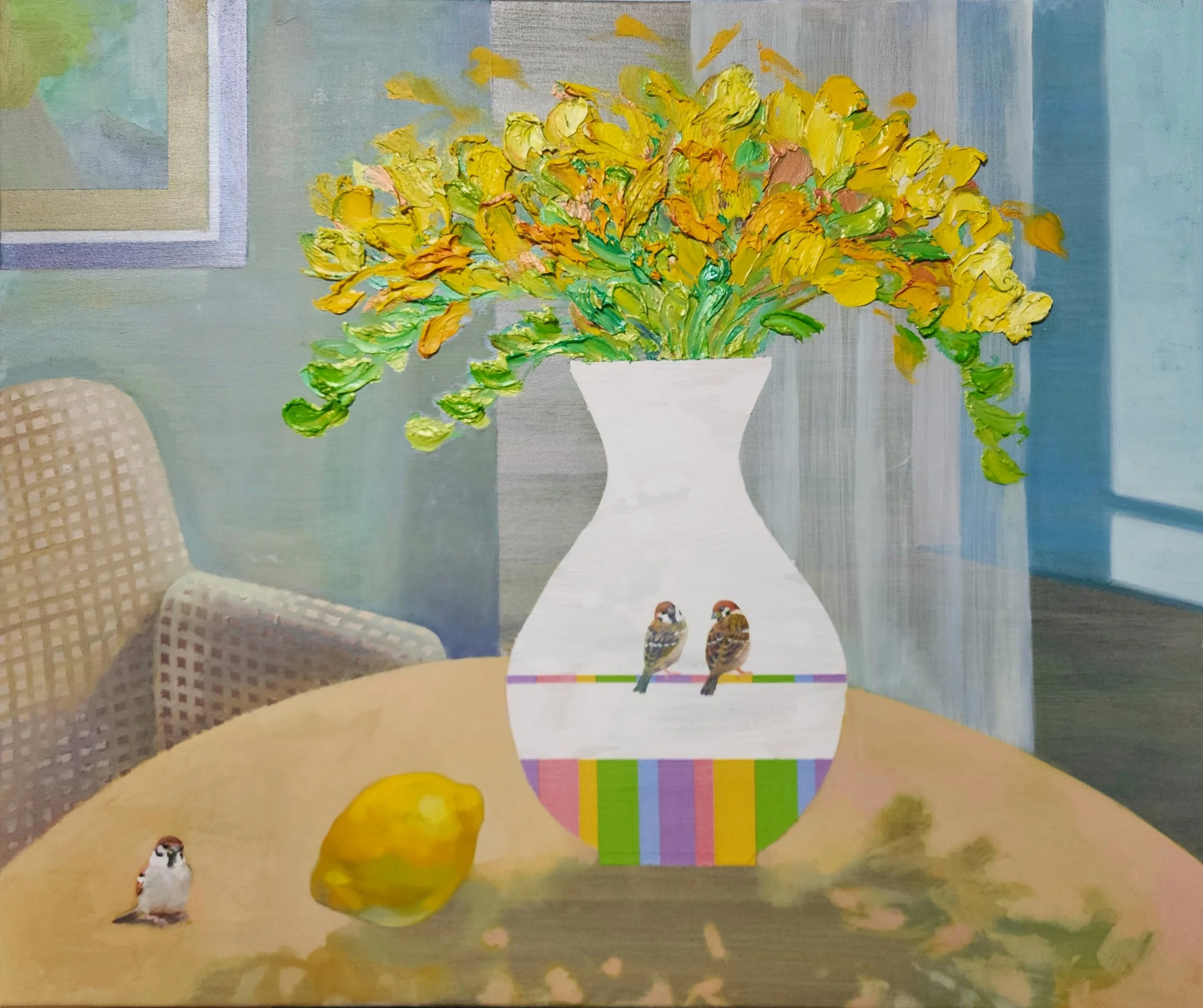 The yellow freesias arranged in the vase symbolize the gentle warmth of spring, while the small sparrow in the scene represents modern urban individuals.